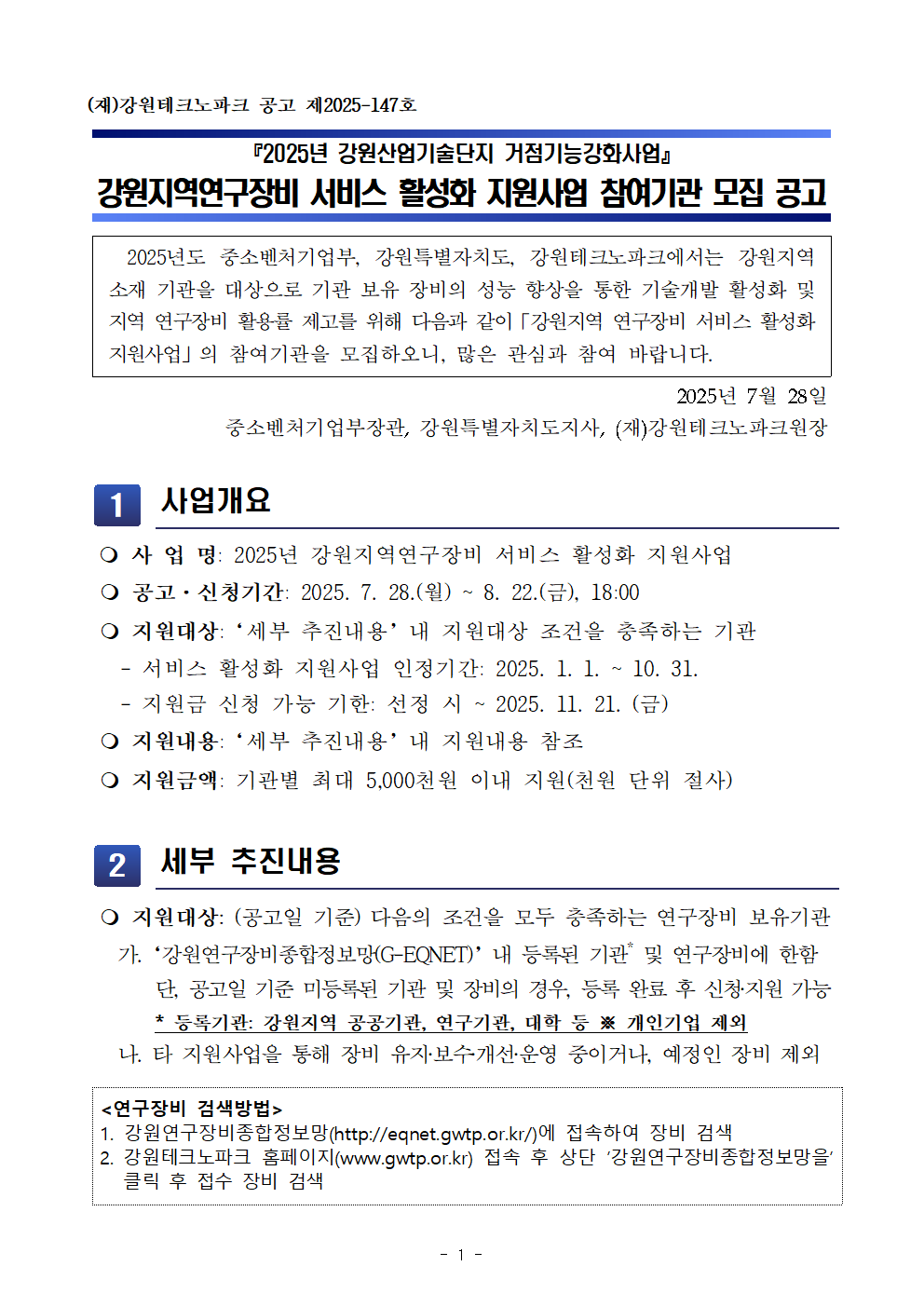 제 목 : 2025년 강원지역 연구장비 서비스 활성화 지원사업 참여기관 모집 공고
